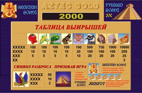 Среди специальных символов на Вашем пути повстречаются «рассыпная» змееподобная птица, бонусная пирамида и «дикая» голова ацтеков, которая делает Ваш выигрыш еще более крупным. Для ознакомления с перечнем всех коэффициентов выплат есть специальное меню.